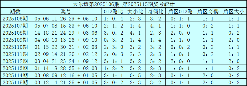 体彩大乐透第25115期奖号为:03 12 14 21 35+01 05,前区奖号012路比为3:0:2,奇偶比为3:2,大小比为2:3,后区0路号码轮空。