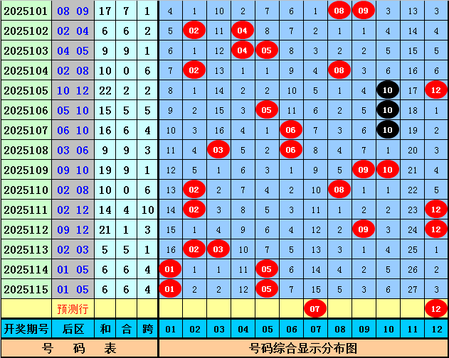 后区分析(一区01-04,二区05-08,三区09-12):上期后区开出奖号01和05,最近10期后区三区落号比为7:12:7,本期后区关注号码03、05、07、11、12,后区两码参考07、12。