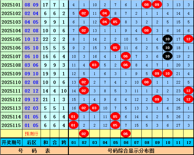 后区分析:在第116期历史同期开奖中,和值大小为10:7,跨度奇偶比为7:10,本期后区注意两码02和06。