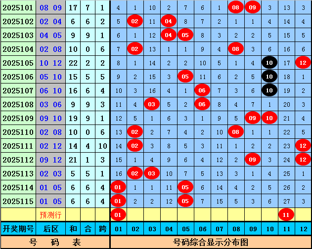 后区分析:上期后区开出1路+2路号01和05,最近30期后区奖号012路比为18:21:21,最近10期后区奖号012路比为8:5:7,本期后区注意号码01、07、09、11、12,单挑两码组合01、11。