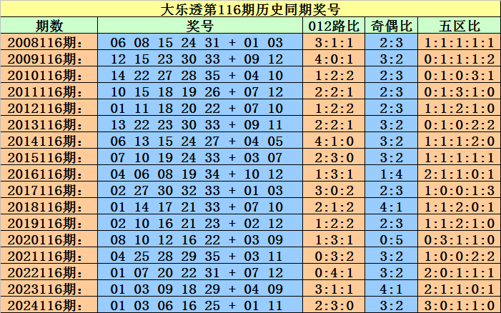 上期开奖:大乐透第2025115期开奖:03、12、14、21、35+01、05,前区012路比为3:0:2,奇偶比为3:2,五区比为1:2:1:0:1,大小比为2:3。