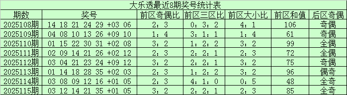 大乐透第2025115期奖号为:前区:03、12、14、21、35,后区:01、05。其中前区奇偶比为3:2,大小比为2:3,三区比为2:2:1,和值为85。