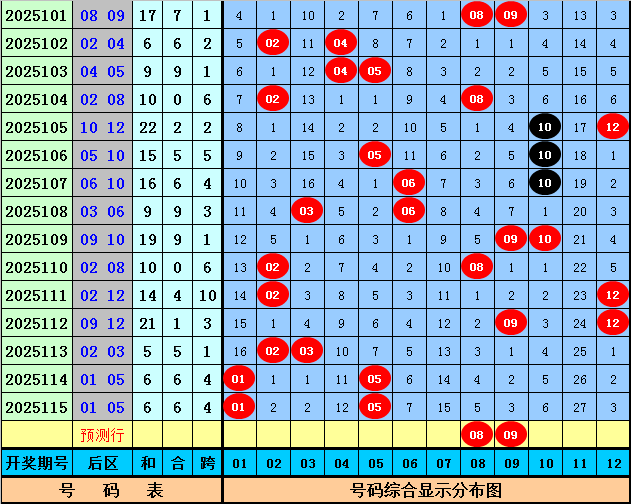 后区分析:上期后区开出号码01和05,最近10期后区奖号奇偶比为9:11,大小比为8:12,本期后区看好号码02、03、08、09、12,后区单挑两码08、09。