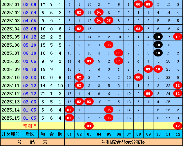 后区上期开出奖号01和05,该组合历史上出现了36次,其下期奖号频次分别为:号码05出现9次,01、03、08出现8次,02出现7次,07、10、11出现6次,04出现5次,06出现4次,12出现2次,09出现1次,本期后区参考号码03、06、08、12,精选两码03和12。