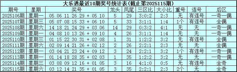 前区大小分布:上期前区奖号大小比为2:3,小 号开出较多,最近10期前区奖号大小比为21:29,小 号出现比例较高,本期预计小 号继续热出,推荐大小比1:4。