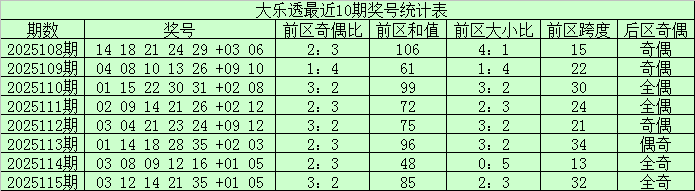 前区奇偶比:最近30期前区奖号奇偶个数总比例为71:79,总体来看偶数优势比较明显;前10期前区奖号奇偶比例为25:25,奇偶号码走势相当;上期前区奖号奇偶比为3:2,本期预计奇数号码继续大热,重点看好奇偶比3:2。