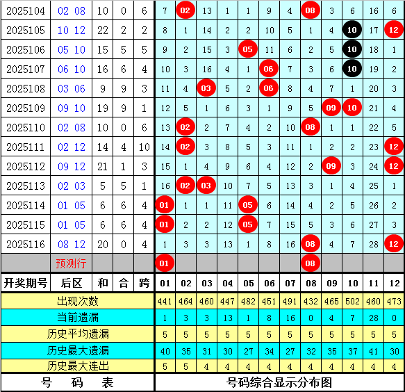 后区判断:上期后区奖号为08和12,开出温码+热码组合。最近十期后区开出10个热码、7个温码和3个冷码,本期预计奖号关注热码+热码组合,参考两码01、08。