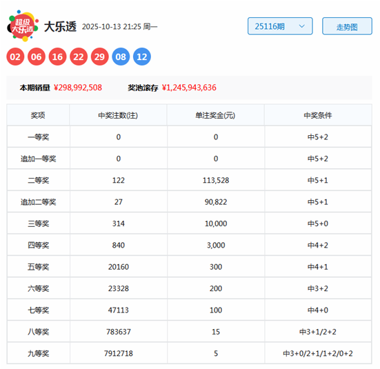 大乐透第2025116期开出奖号为:02、06、16、22、29+08、12。其中前区奇偶比为1:4,三区比为2:2:1,大小比为2:3,后区开出全偶组合。
