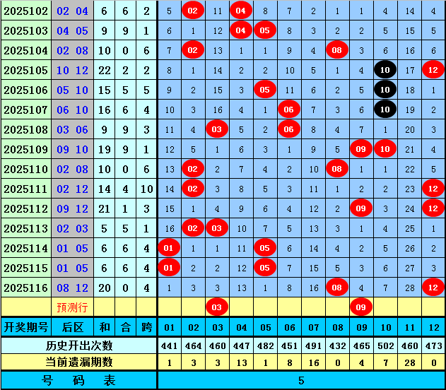 前区第一位推荐:在连续5期开奖中分别出号:03、01、03、03、02,均值为2.4,其中偶数奖号出现较少,本期适当关注偶数号码回补,参考号码12。