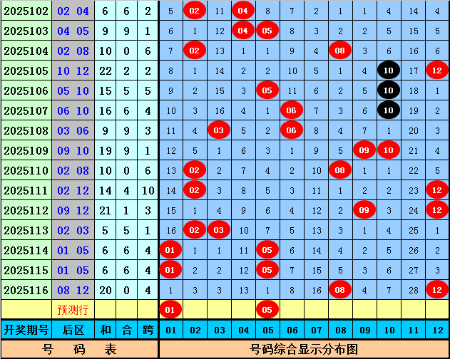 后区奖号分析:上期后区开出奖号08+12,奖号和值为20,跨度为4,本期预计后区和值转小,关注两码01 05。
