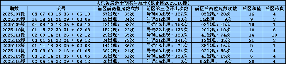 体彩大乐透第2025116期奖号为:02 06 16 22 29+08 12,前区号码大小比开出2:3,012路比开出1:2:2,奇偶比开出1:4,后区号码和值开出20,跨度开出4。
