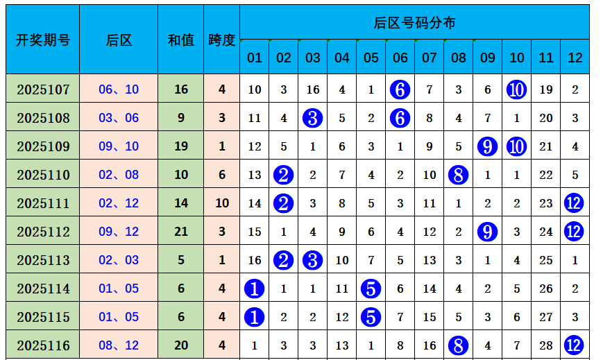 上期后区开出奖号08、12,奇偶比0:2,近10期奇偶比8:12,偶数奖号开出较热,本期推荐奇偶比1:1,参考后区号码07、12。