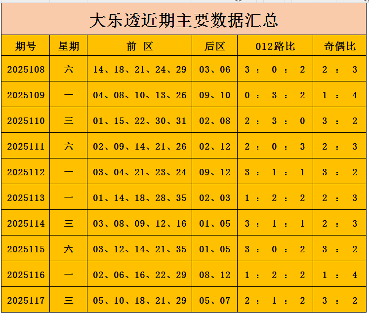 前区奇偶分析:上期前区开出奇数3个,偶数2个,奇偶比3:2,近10期奇偶比22:28,整体看偶数球出现次数多,本期预计奇数球热出,推荐奇偶比3:2。