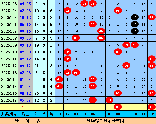 后区分析:上期后区开出号码05和07,最近10期后区奖号奇偶比为10:10,大小比为9:11,本期后区看好号码03、04、08、11、12,后区单挑两码08、12。