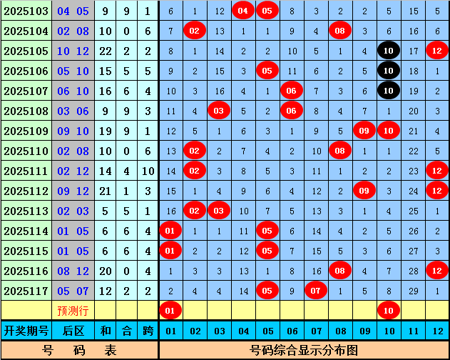 后区上期开出奖号05和07,该组合历史上出现了53次,其下期奖号频次分别为:号码12出现13次,11出现12次,02出现10次,03、04、07出现9次,01、06、08、10出现8次,05、09出现5次,本期后区参考号码01、04、10、12,精选两码01和10。
