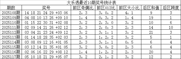 大乐透第2025117期奖号为:05 10 18 21 29+05 07。当期前区奖号012路比为2:1:2,冷热比为1:4,包含1个重号:29,没有开出连码,后区开出全奇、一大一小组合。