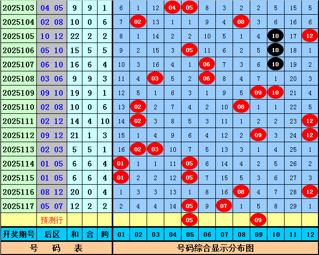 前区冷热码分析:上期前区开出2个冷码:05、10,前区奖号冷热个数比为2:3,最近10期前区奖号冷热出号个数比为24:26,前区冷热奖号出号比例基本相当,本期前区号码冷热比推荐3:2,参考前区冷码奖号20、26、33。