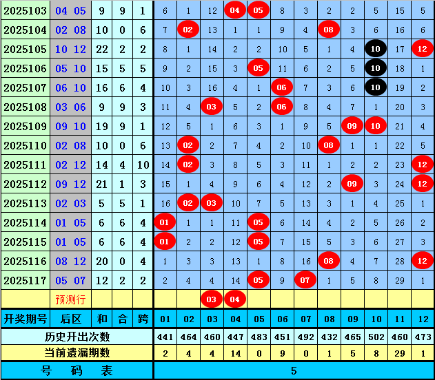 后区第一位推荐:在连续5期开奖中分别出号:02、01、01、08、05,均值为3.4,其中奇数奖号表现相对较热,本期没有转冷的迹象,注意再次出现,关注号码03。
