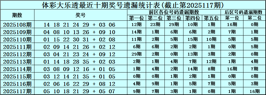 第2025117期奖号:05 10 18 21 29 + 05 07 ,各位号码遗漏期数为:9期、7期、3期、1期、0期 + 1期、16期。
