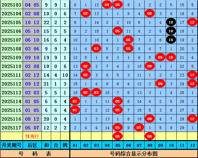 后区分析:后区上期开出号码05和07,分别遗漏1期和16期,目前后区01-12区间冷温热号码个数比为2:5:5,本期后区注意号码05+08。