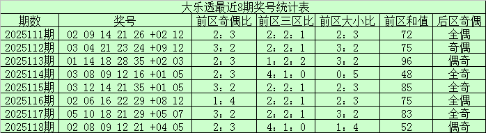大乐透第2025118期奖号为:前区:02、08、09、12、21,后区:04、05。其中前区奇偶比为2:3,大小比为1:4,三区比为4:1:0,和值为52。