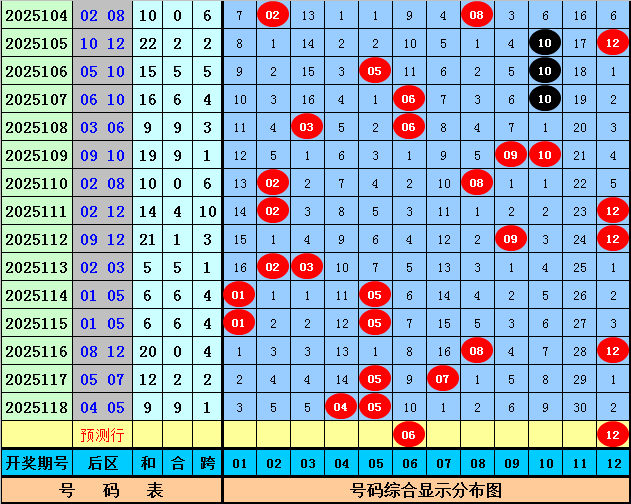后区上期开出奖号04和05,该组合历史上出现了48次,其下期奖号频次分别为:号码08出现13次,02出现10次,03、06、10出现9次,04、09、12出现8次,01、07出现7次,05、11出现3次,本期后区参考号码06、09、10、12,精选两码06和12。
