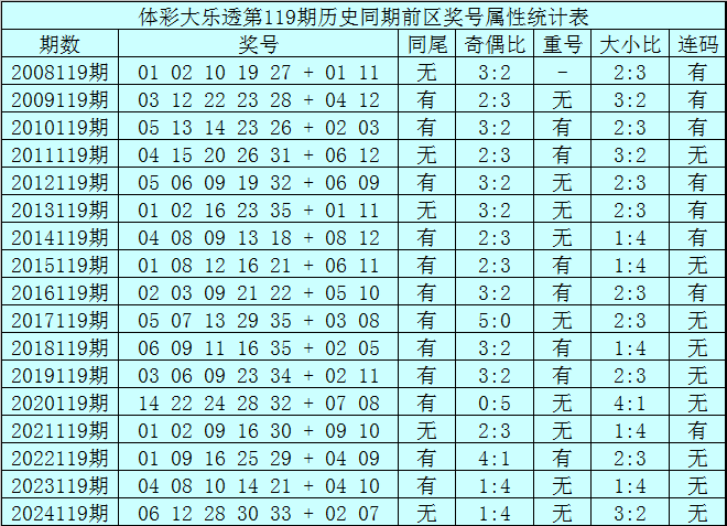 体彩大乐透第119期历史同期开出17次奖号,其统计详见下表: