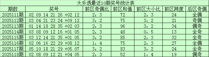 大乐透第25118期奖号为:02、08、09、12、21+04、05。其中前区和值为52,奇偶比为2:3,大小比为1:4。后区为全小、一奇一偶组合。
