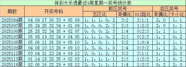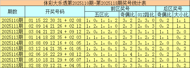 体彩大乐透第2025118期奖号为02 08 09 12 21 + 04 05,前区号码五区比为1:3:1:0:0,奇偶比为2:3,012路比为3:0:2,后区号码奇偶比为1:1,大小比为0:2。