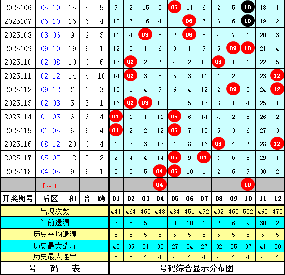 石浩第2025119期大乐透后区分析:后区上周星期一后区奖号为08和12,上期开出奖号04和05,最近9周星期一与最近9期后区奖号大小比分别为10:8和7:11,奇偶比分别为10:8和9:9,本期看好后区出现全偶组合,关注号码04、08、10、12。