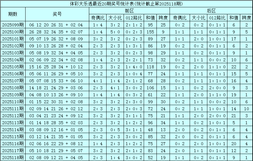 大乐透第2025118期开奖号码为:02、08、09、12、21+04、05。其中前区奖号奇偶比为2:3,大小比为1:4,和值为52,跨度为19,后区奖号奇偶比为1:1,大小比为0:2。