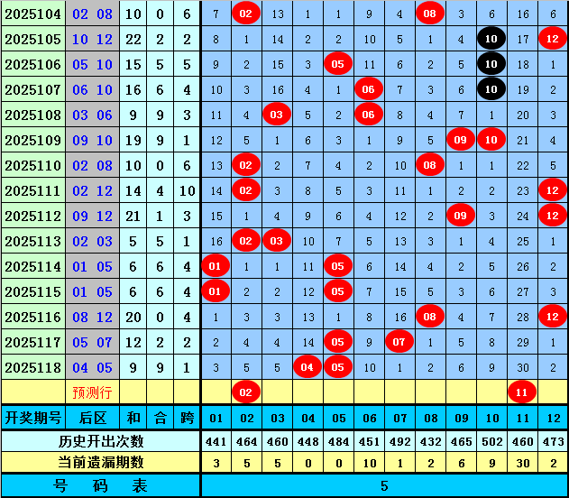 后区第二位推荐:在连续5期开奖中分别出号:05、05、12、07、05,均值为6.8,其中奇数奖号表现相对较热,本期没有转冷的迹象,注意再次出现,关注号码11。