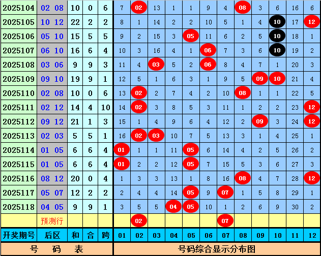 后区分析:上期后区奖号为04+05,开出全小组合,上周一后区奖号开出08+12,最近十周一后区奖号大小比为11:9,大小 号码走势基本相当,本周一看好大小 号码继续平衡,关注两码02、07。