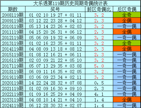 后区分析:在第119期历史同期开奖中,后区奖号奇偶比为15:19,最近5年同期后区奇偶走势为:一奇一偶、一奇一偶、一奇一偶、全偶、一奇一偶,今年同期看好再出一奇一偶组合,关注号码03、06。