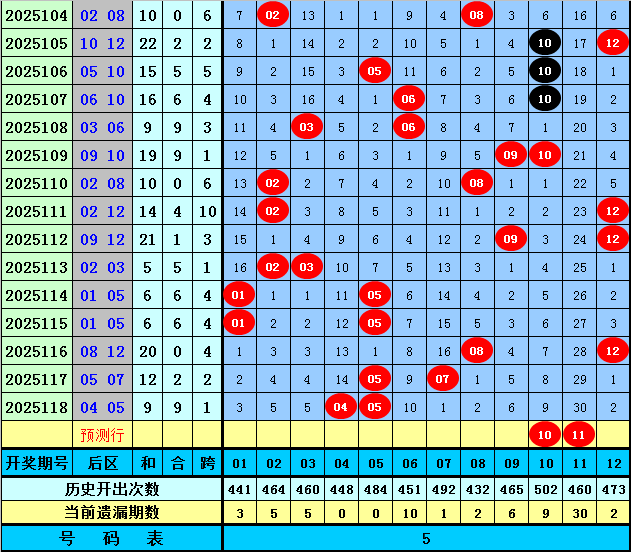 前区一号球上期开出2路奖号02,最近10期前区一号球出现范围在01-05区段,其中012路号码分别开出3个、3个和4,本期前区一号球防2路号码再出,参考号码08。