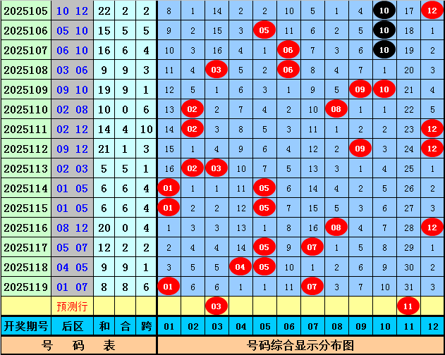 后区分析:上期后区开出1路+1路奖号:01和07,最近20期后区奖号012路比为11:13:16,2路号码走势较热,目前012路号码分别遗漏3期、0期、1期,本期后区注意号码01、03、07、11、12,两码参考03、11。