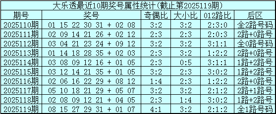 大乐透第2025119期开奖号码:08 15 27 29 31 + 01 07。前区奖号大小比为3:2,奇偶比为4:1,012路比为2:1:2,后区为全1路号码。