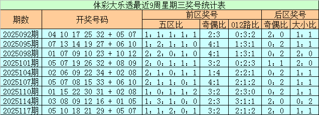 上期回顾:体彩大乐透上周星期三(第2025117期)奖号为05 10 18 21 29 + 05 07,前区奖号五区比为1:1:2:0:1,奇偶比为3:2,012路比为2:1:2,后区奖号奇偶比为2:0,大小比为1:1。