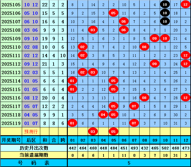 后区分析(定义:01-04为一区,05-08为二区,09-12为三区):上期后区开出奖号01和07,分别出现在第一区和第二区和区,最近10期后区三个区间落号个数比为8:8:4,本期后区注意第一区和第二区号码出现,关注两码03、05。