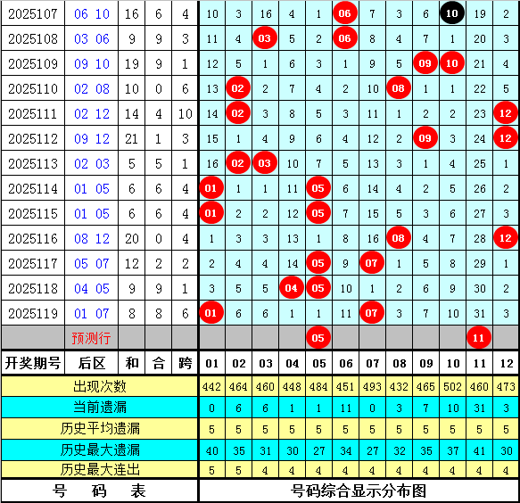 后区分析:最近10周星期三一大一小开出7次,全大开出2次,全小开出1次;一奇一偶开出2次,全奇开出3次,全偶开出5次,本期后区注意两码05+11。