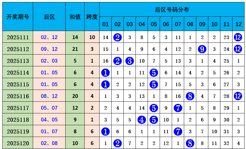 上期后区开出奖号02、08,奇偶比0:2,近10期奇偶比11:9,奇数奖号开出较多,本期推荐奇偶比1:1,参考后区号码01、04。