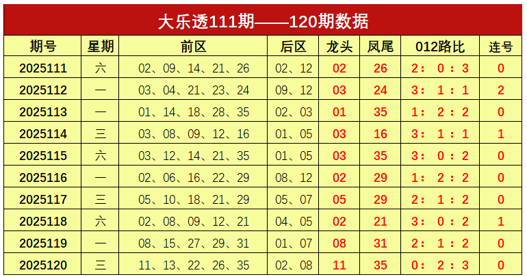 大乐透第2025120期出奖号统计:前区11、13、22、26、35,后区02、08。龙头11,凤尾35,012路比为0:2:3,未开出连号。