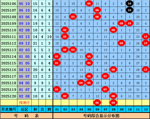 后区分析:在第121期历史同期开奖中,和值大小为5:12,跨度奇偶比为8:9,本期后区注意两码06和08。