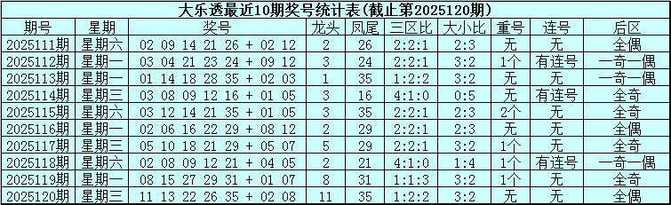 大乐透第2025120期奖号为:11、13、22、26、35+02、08。其中前区三区比为1:2:2,大小比为3:2,没有出现重号,没有出现连号,后区为全偶号码。