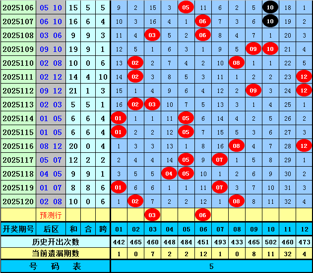 后区分析:上期后区开出一大一小组合:02+08,最近10期后区奖号大小比为8:12,本期预计后区开出全小组合,看好两码03、06。