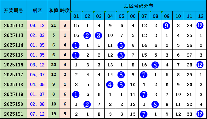 后区分析:上期后区开出07 12,开出和值19,和值范围在5-21之间,波动范围较大,本期预测和值下降趋势,重点关注号码06 08,和值14。