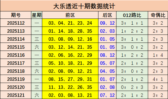 大乐透上期开奖号为:02 03 08 13 21,后区07 12;012路比2:1:2,奇偶比3:2。