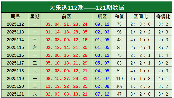 大乐透第2025121期出奖号统计:前区02、03、08、13、21,后区07、12。和值为47,区间比为3:2:0,奇偶比为3:2。