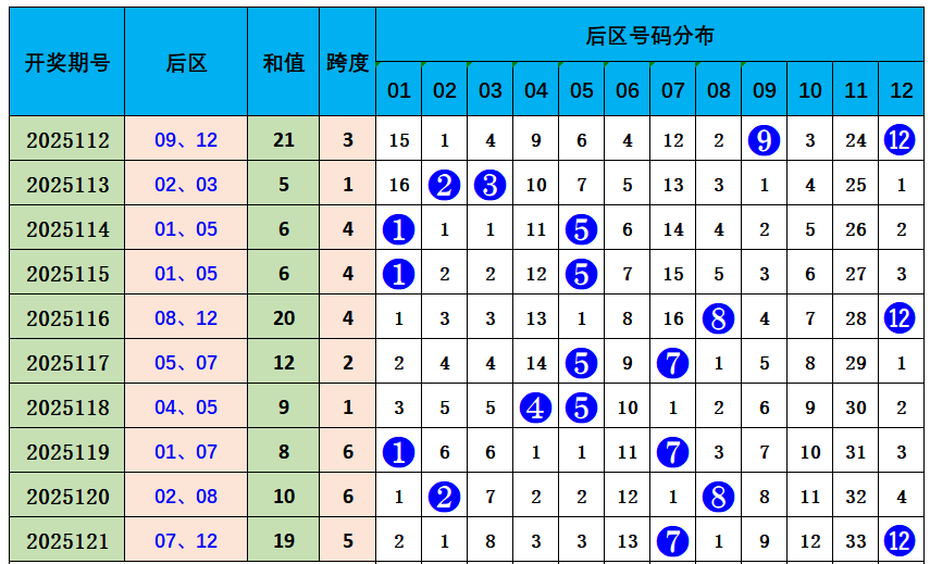 上期奖号开出07、12。最近10期开出大奖号9枚,小奖号11枚,大小比为9:11,本期预测开出大小比为1:1,推荐后区奖号:03、12。