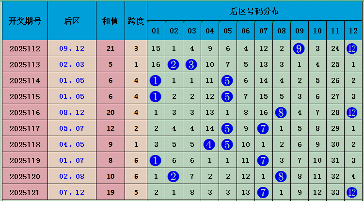 上期后区开出号码07 12,和值19,近十期和值10 14 21 5 6 6 20 12 9 19,和值波动范围较大,本期预测和值会下降,重点关注号码:03 11,和值14 。